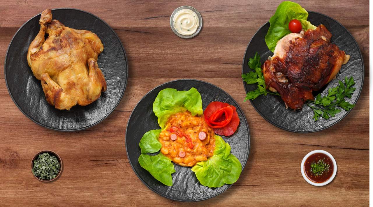 Pohovani pilećI file 150gr, pomfrit, lepinja, vitaminska salata, 2 vrste sosa
