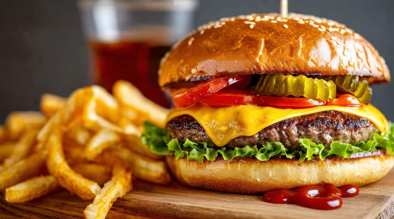 Juneći burger 150g, domaći roštilj sos, karamelizovani luk, slaninica, cheddar