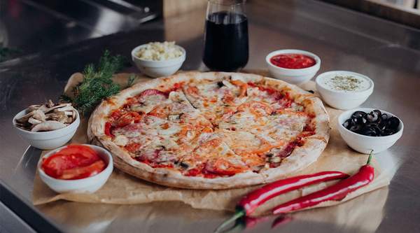 Томатний соус, моцарела, перець Чілі, оливки чорні, салямі Папероні гостра.