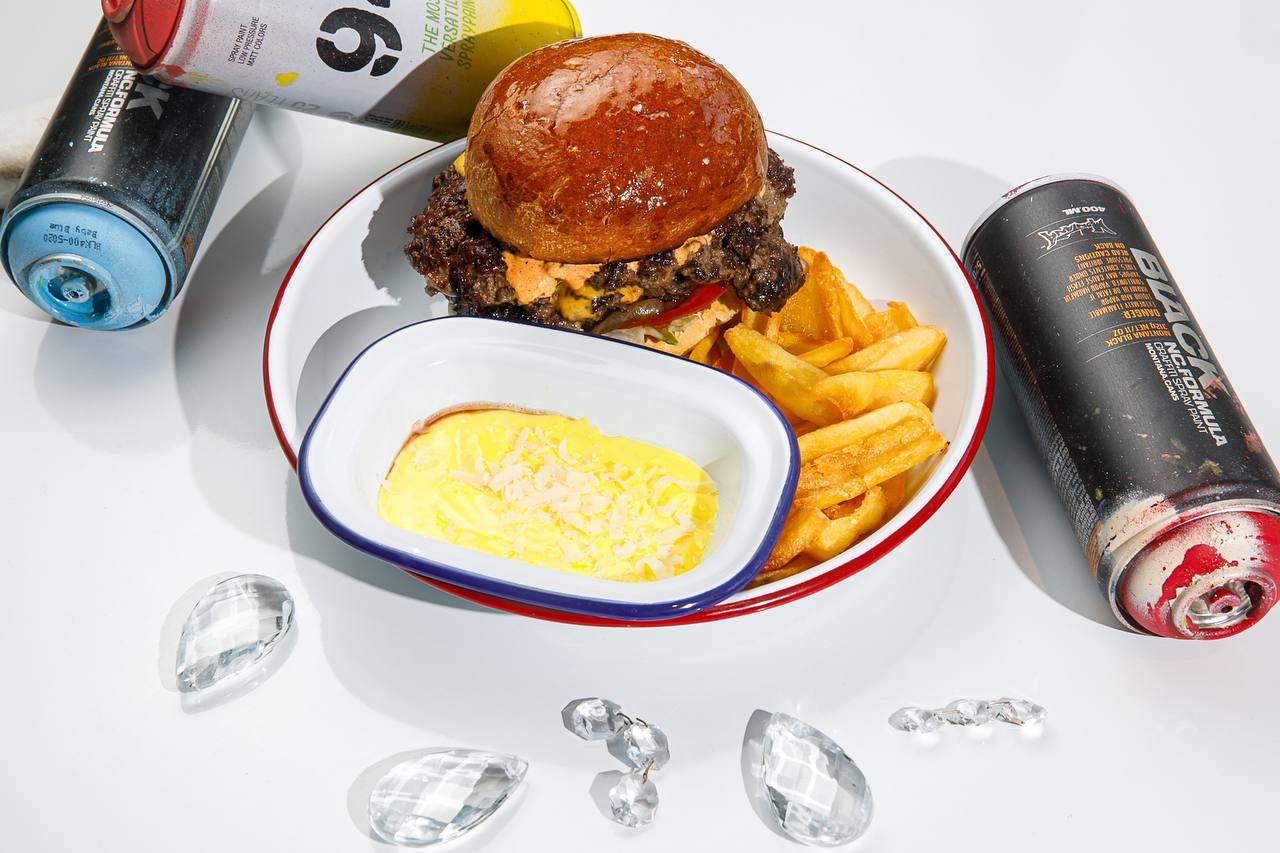 Булку самі робили, котлетос яловичий, хрусткий бекон, сир чедер, свіжий томат, салат Айсберг, огірок маринований, цибулевий джем, фірмові соуси: BBQ та часниковий+ ХРУСТКА КАРТОПЛЯВеганська котлета+100грн