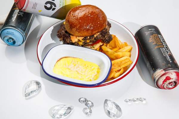 Булку самі робили, котлетос яловичий, хрусткий бекон, сир чедер, свіжий томат, салат Айсберг, огірок маринований, цибулевий джем, фірмові соуси: BBQ та часниковий. + ХРУСТКА КАРТОПЛЯ+СИРНА ВАННА