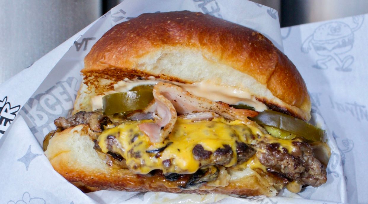 Булка, яловича котлета, цибуля ріпчаста, бекон, огірки мариновані власного виробництва, перець Халапеньйо, слайс сиру Чеддер, соус Айолі, соус Барбекю