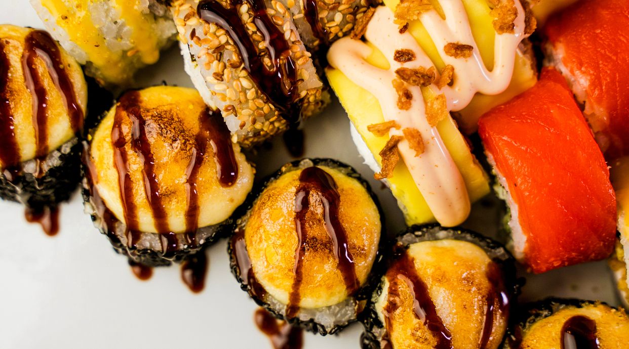 Рис, норі, креветки, панко, темпура, краб-крем, тамаго, спайс соус, горіховий соус, соус унагі