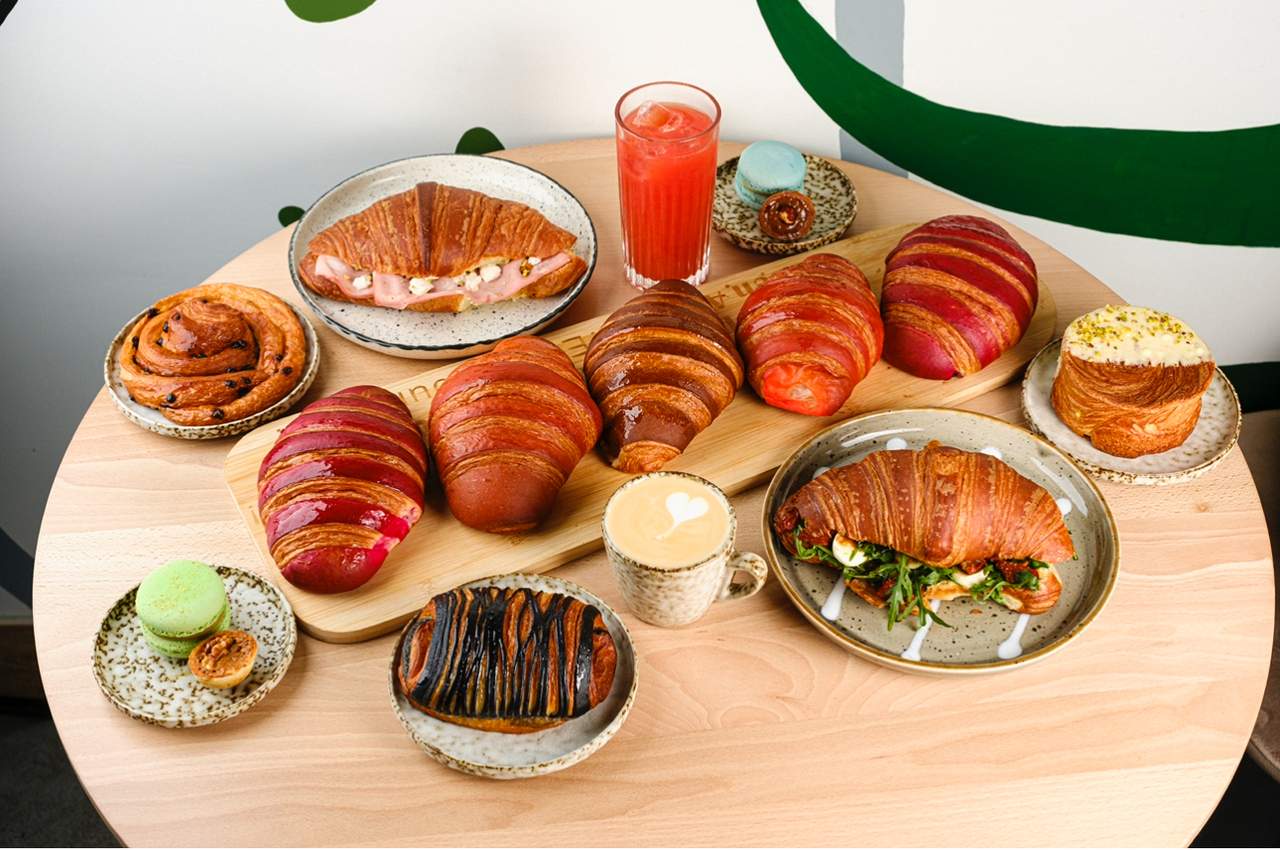 Малиновий круасан, борошно фісташкове, борошно мигдалеве, фісташкова паста, вершкове масло 82%, яйця, цукор, цукровий сироп, фісташкова крихта.