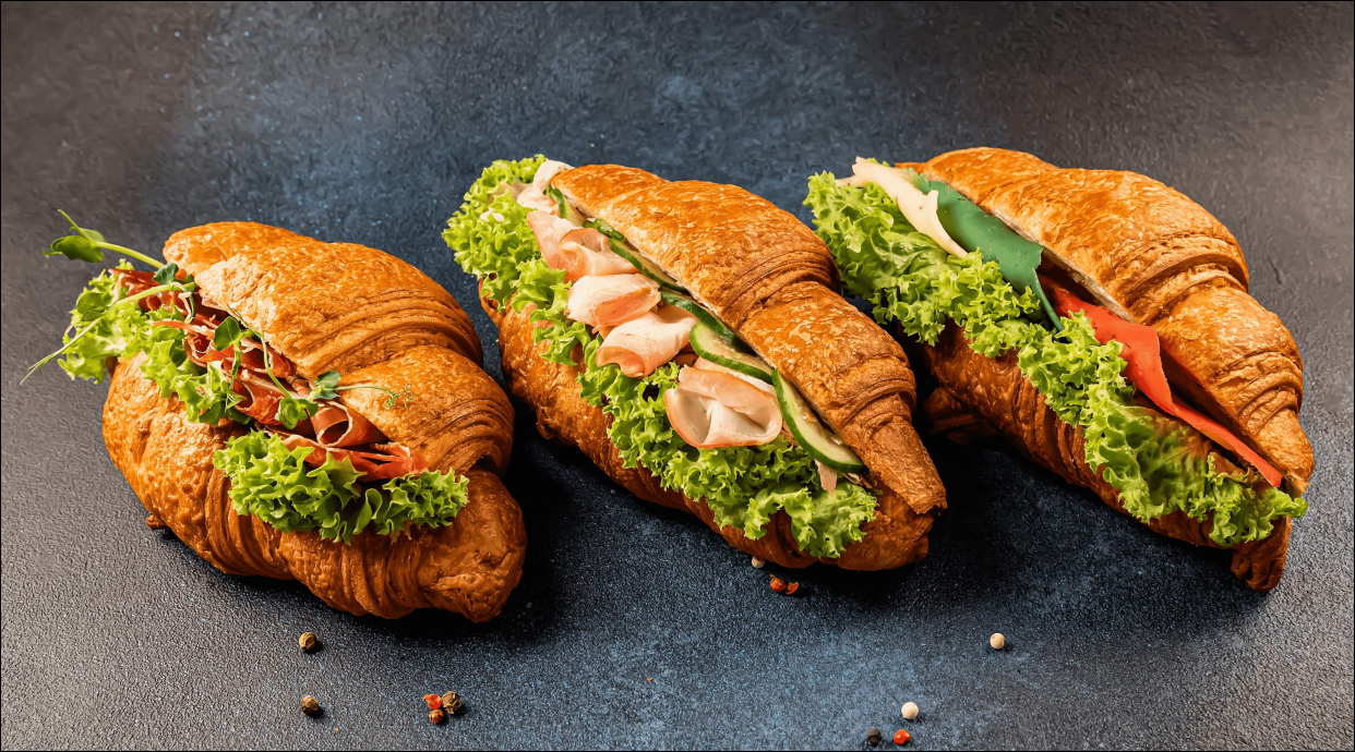 Круасан зерновий, хамон, крем-сир, листя салату, огірок