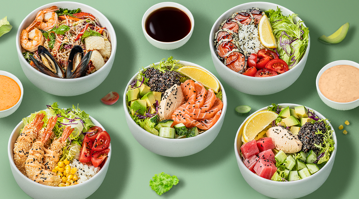250 г Креветки, кіноа, огірок, помідор, мікс салату, крем сир, соус Устричний, соус Азія BBQ, соус Ланч Кінг, соус Горіховий, лимон, кунжут