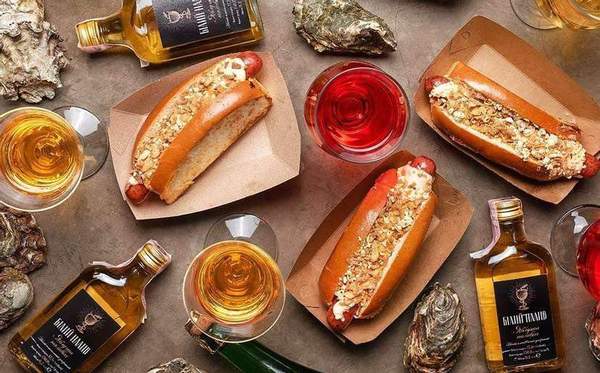 Хот-дог у вершковій булочці з молочною сосискою з соусом з сиру дор блю та фірмовою присипкою з яблучних і цибулевих чіпсів. Краще смакує з сиром чеддер