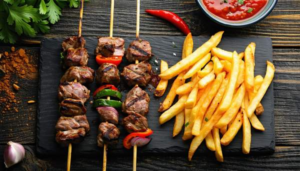 Картопля по-селянськи - 100гКуряча ковбаска - 1штКурячі крила - 150гШашлик з курячого стегна - 150гСоус BBQ - 50г