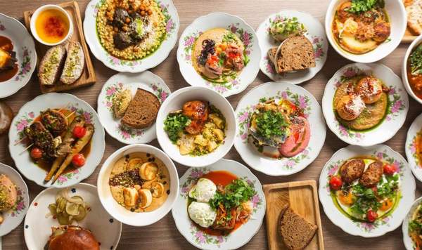 Хумус, пряні маринади - цвітна капуста-карі/морква/огірок/кінза. Яйця по-турецьки, мухамара (паста з печених солодких перців, гранатовий соус, горіхи, часник, цибуля, пряні спеції) подаємо з двома видами оливок. Хліб пшеничний на заквасці