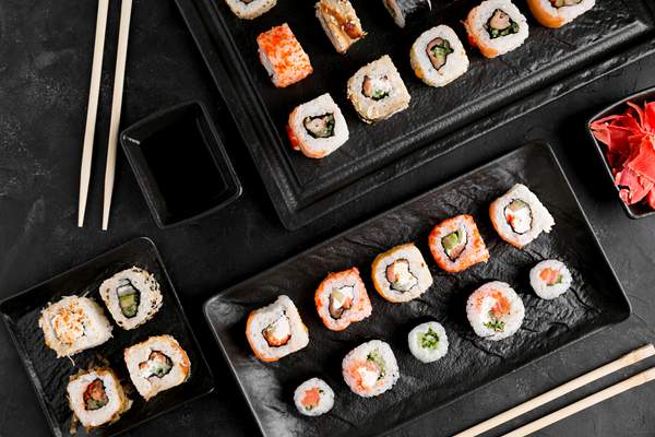 Філадельфія з лососем, Каліфорнія з лососем, Рол з креветкою в ікрі, Токіо, Чорний дракон