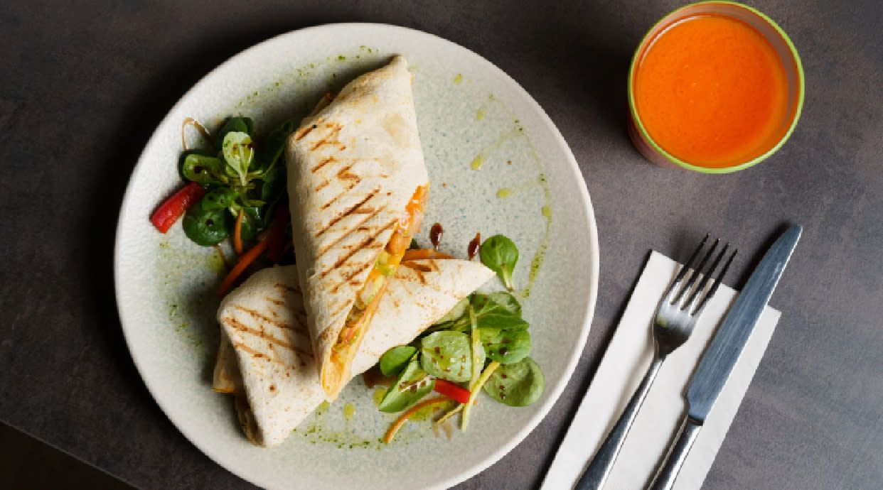 Ніжна яловичина, свіжий салат( білокачанна капуста,помідор,огірок),фірмовий часниковий соус, червоний соус, лаваш.