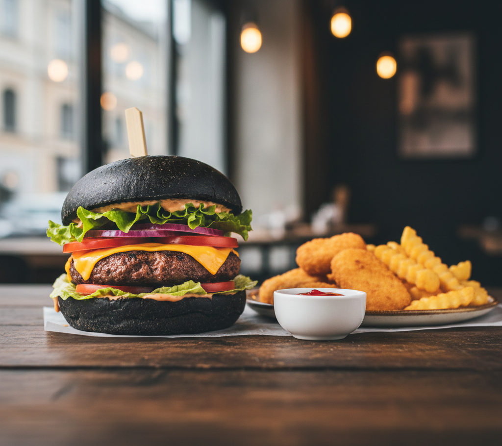 Хрустка булочка з соковитою яловичиною котлетою, з ніжним сиром, огірками, помідором, листям салату, Фірмовий соус