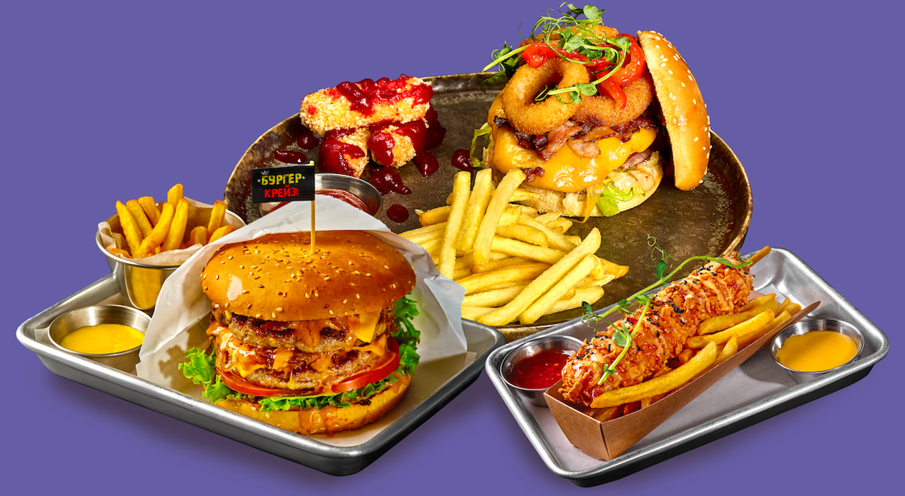 Котлета яловича, бекон, крейзі соус, сир чеддер, карамелізована цибуля, листя салату, помідор, картопля фрі, соус чеддер