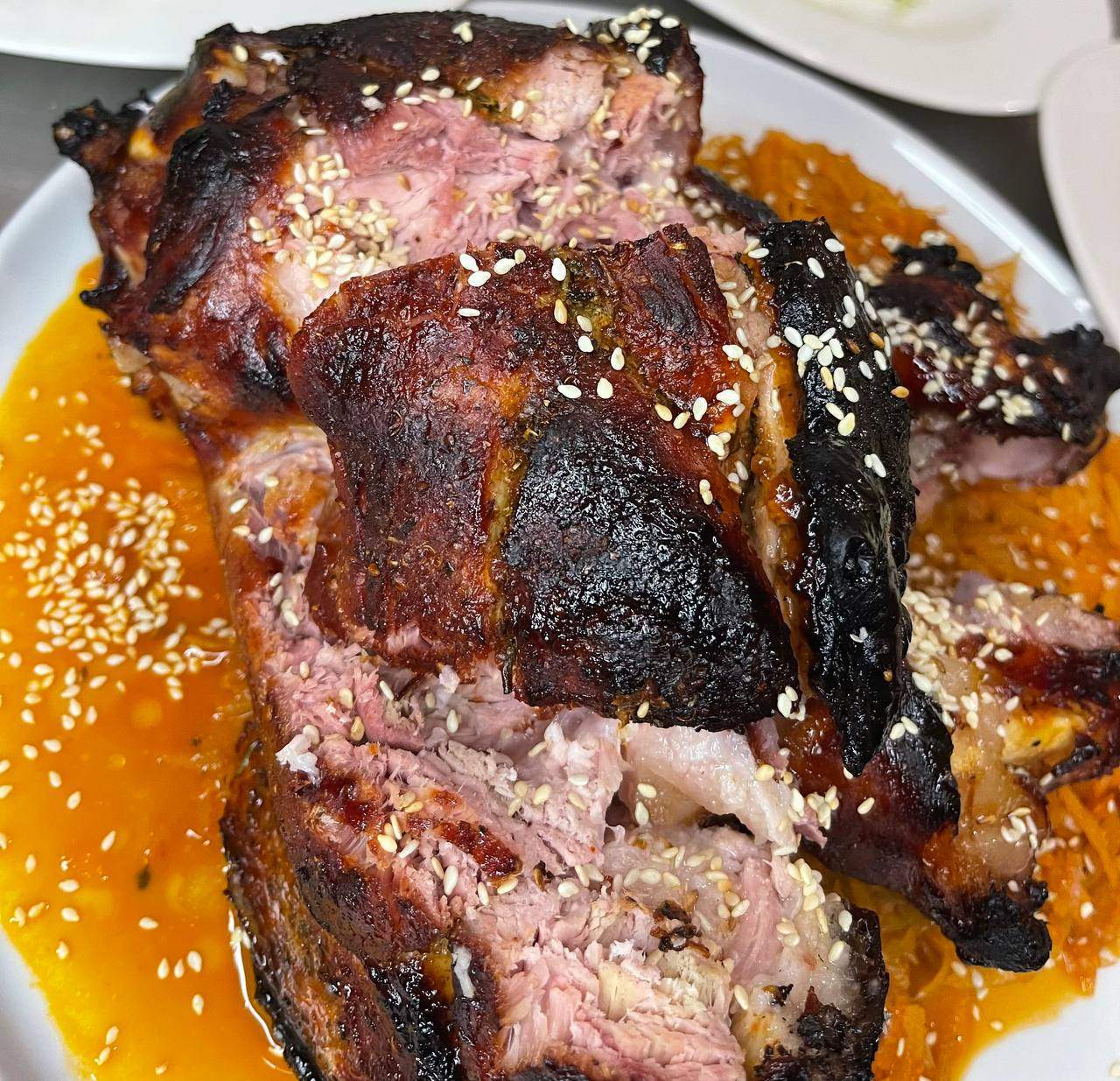 Свинячі ребра (приготовлені методом Су-від), запечені під Томатно-Медовим соусом. Подаються на тушкованій капусті