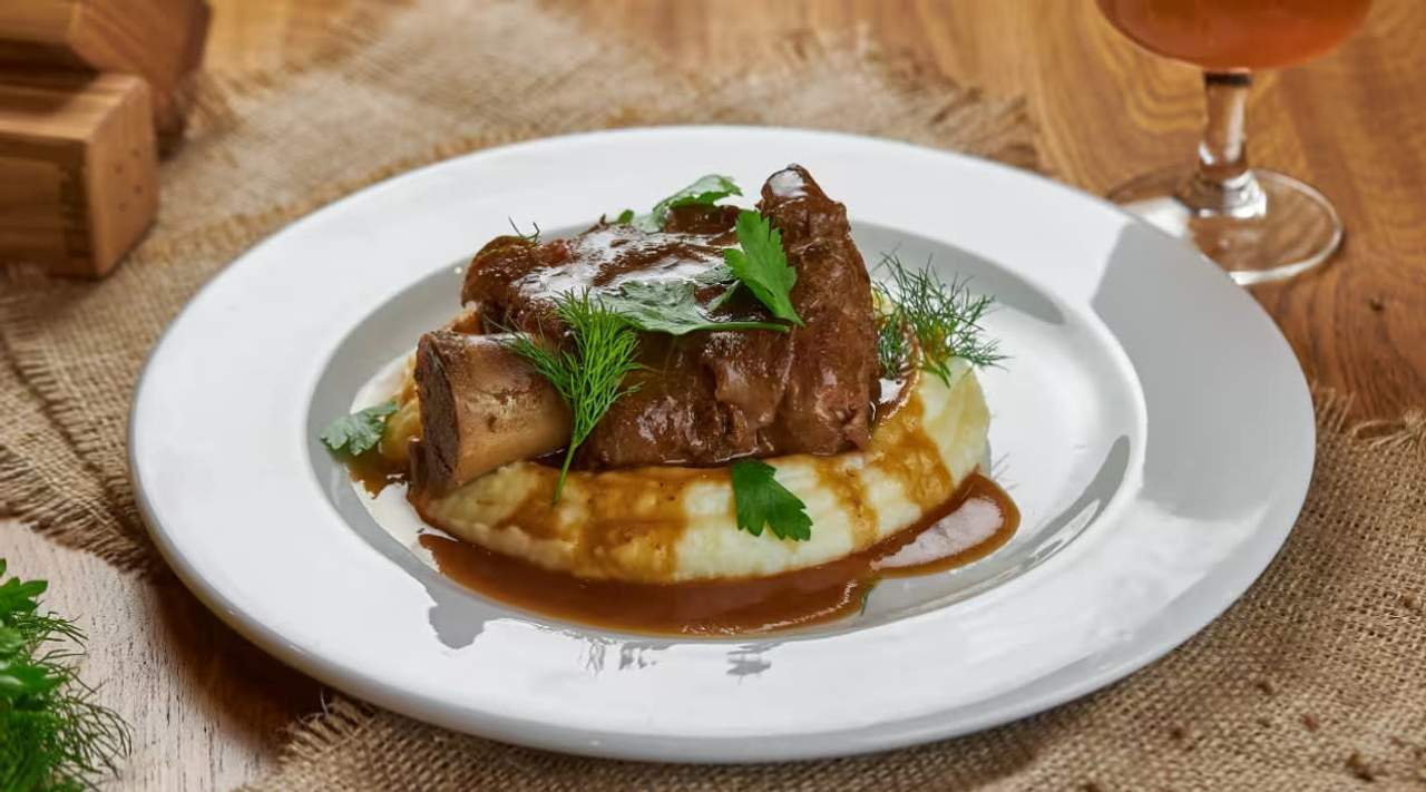 шашлик зі свинини, шашлик з курки, м'ясні свинячі ребра барбекю та медово-гірчичні ребра, курячі азійські крильця та крильця медово-гірчичні, подаємо з картоплею по-селянськи та соусом сацебелі