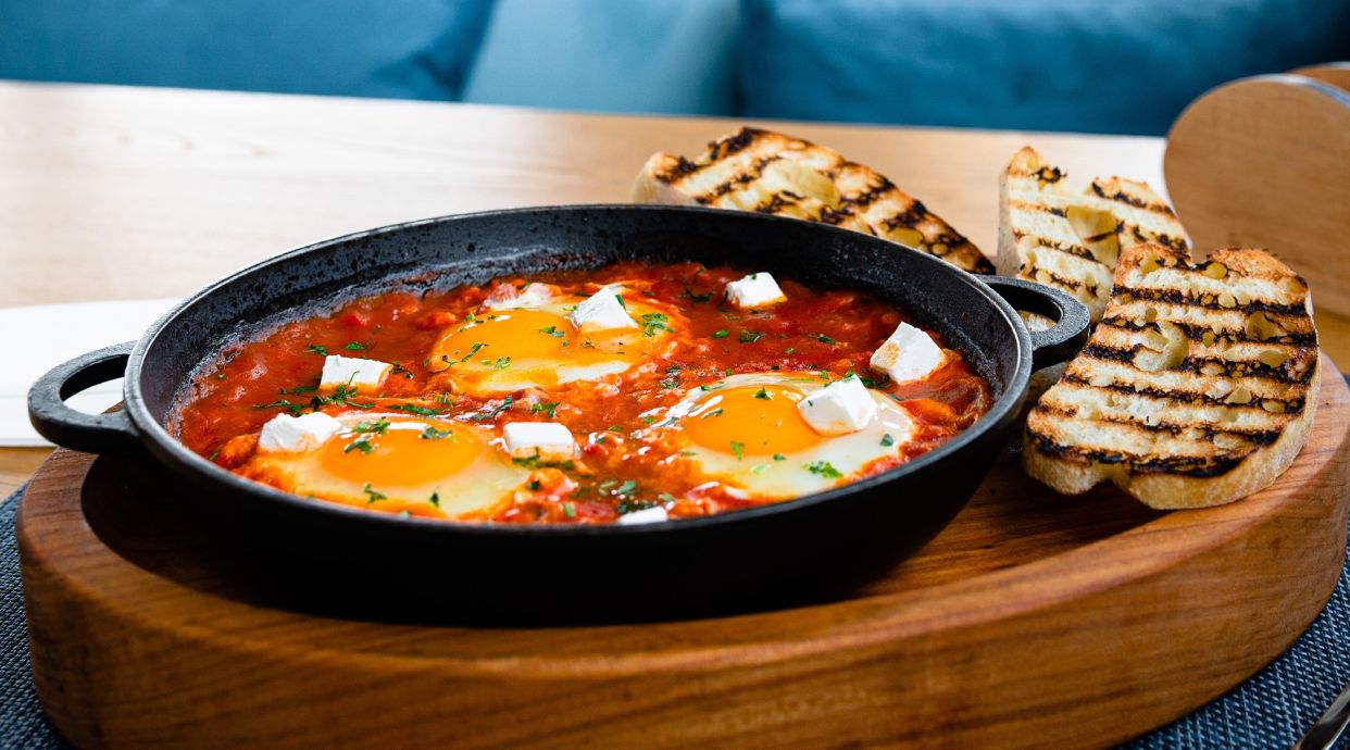 Традиційна близькосхідна страва: яйця, томлені в ароматному соусі з помідорів, болгарського перцю, цибулі та спецій.