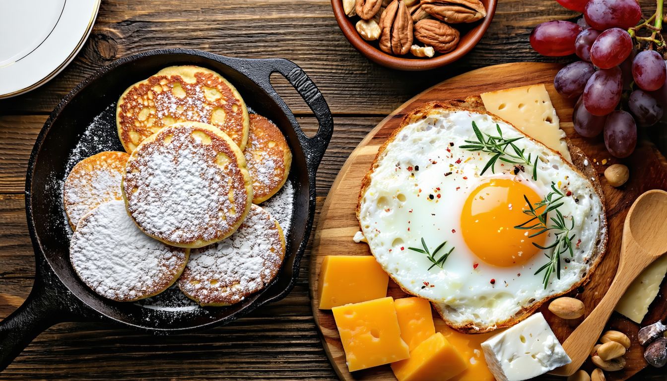 Солодкі сирники у поєднанні з сезонним фруктом, Сметаною та Журавлиновим соусом.