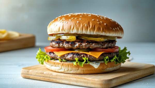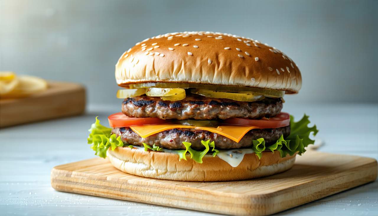 Дві обсмажені котлети з яловичини, салат айсберг, помідор, бекон, цибулеві кільця, сир чеддер, соус BBQ, соус часниковий, булочка бріош