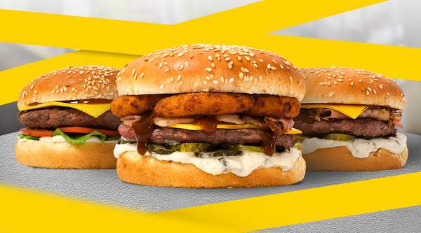 Булочка пшенична, котлета з яловичини, сир чеддер, огірок солоний, соус фірмовий, хрустка цибуля, бекон.