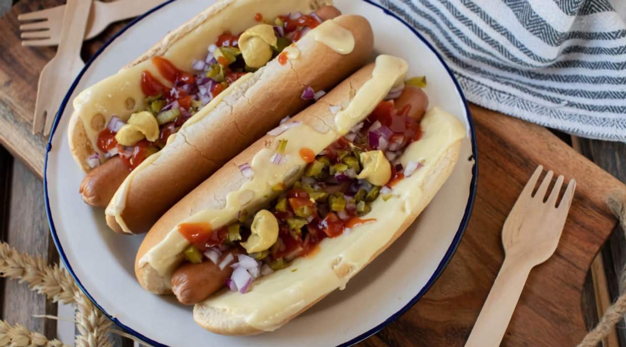 Здобна булочка, дві сосиски , слайси сиру чеддер, сирний соус, листя салату, карамелізований лук, томат, сир пармезан, кетчуп, гірчиця