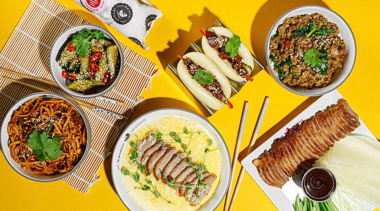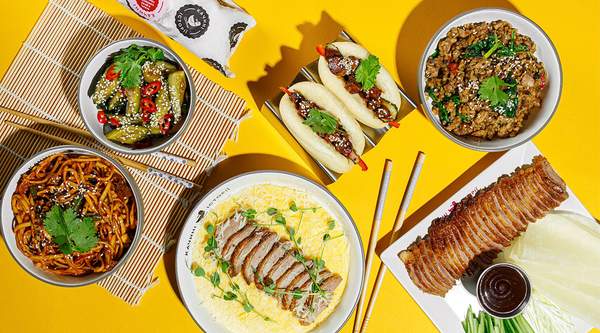Дві пшеничні бао булочки, качка по-пекінськи, Китайський соус на основі Унагі, мариновані огірки, кінза, Болгарський перець