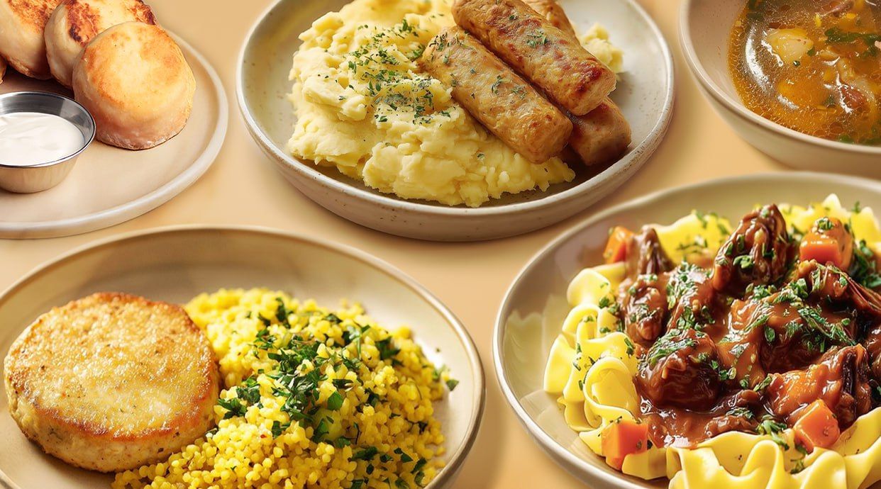 Ніжні м'ясні панкейки з курятини. Подається із золотистим кускусом, овочами та хрусткою смаженою цибулею.