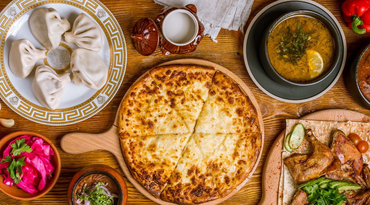 Тісто дріжджове, сир сулугуні та імеретинський, м'ясо свинина та телятина, цибуля ріпчаста, перець чилі, часник, кінза, спеції.
