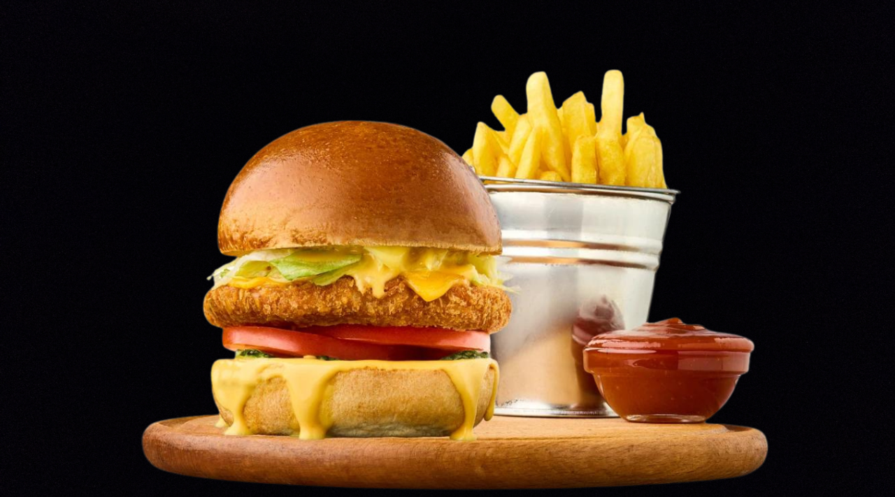 Булка бріош, котлета куряча, кетчуп, огірок маринований, помідор, цибуля карамелізована, сир Чеддер, салат Айсберг, фірмовий соус Бургер, картопля фрі та кетчуп