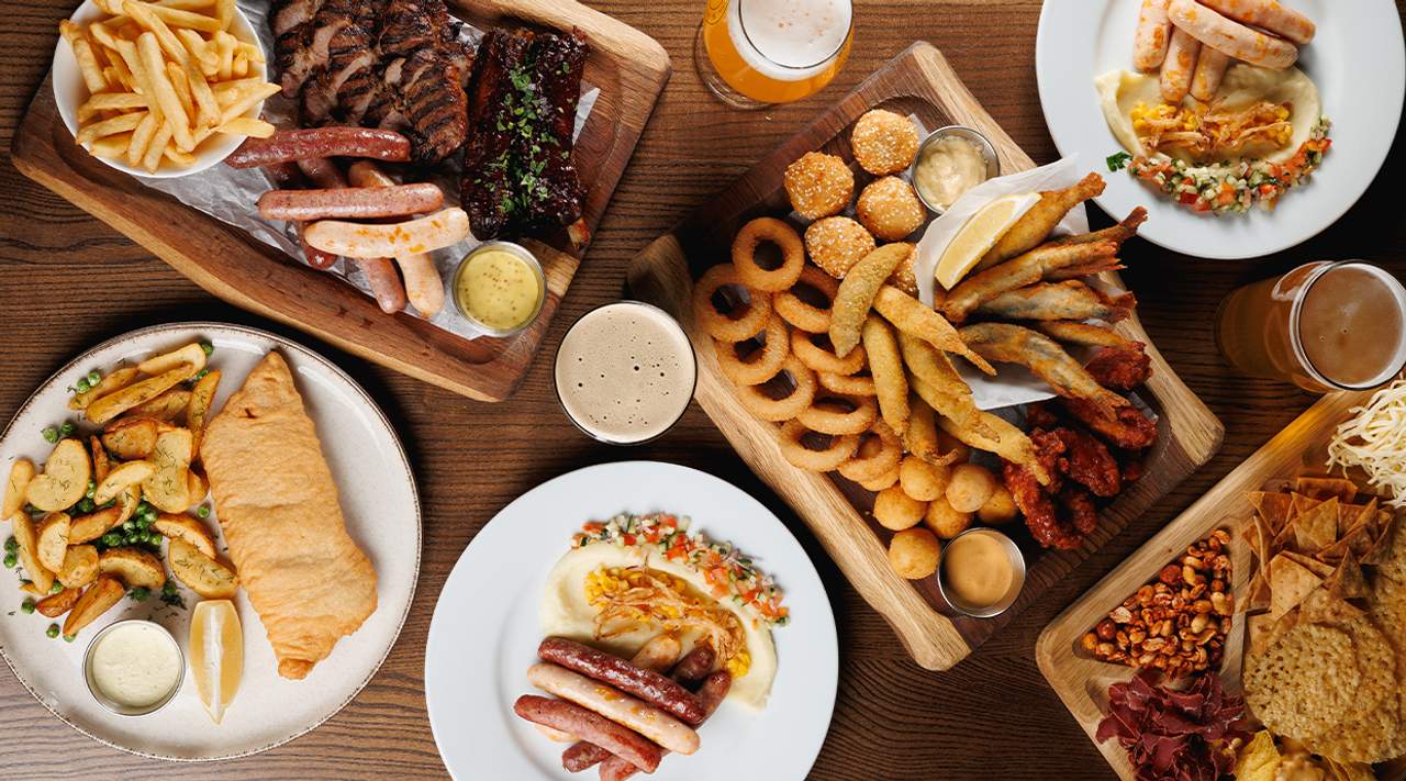 ковбаси мисливські, ковбаси мюнхенські, ковбаси курячі, ковбаси з зернами гірчиці, ковбаси Нюрбинські, печена картопля, кукурудза з беконом та чеддером, тушкована капуста з беконом, буряк маринований, томати черрі, цибуля фрі, соус часниковий, гірчиця