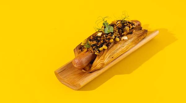 Фірмова булочка з листкового тіста, сосиска, соус із сирів горгонзола, гауда і чеддер, маринований фенхель, мікс салату, пряна груша в червоному вині, медова гірчиця, кріспі цибуля та пармезан.