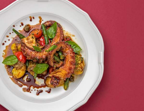 Запечений Судак в маринаді з прованських трав, картопляно-трюфельним пюре, спаржевою квасолею та томатами чері