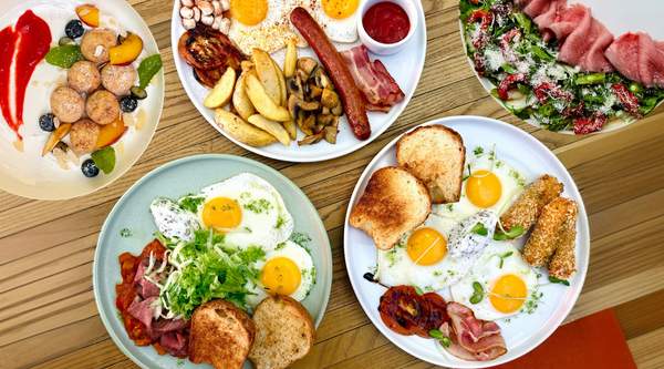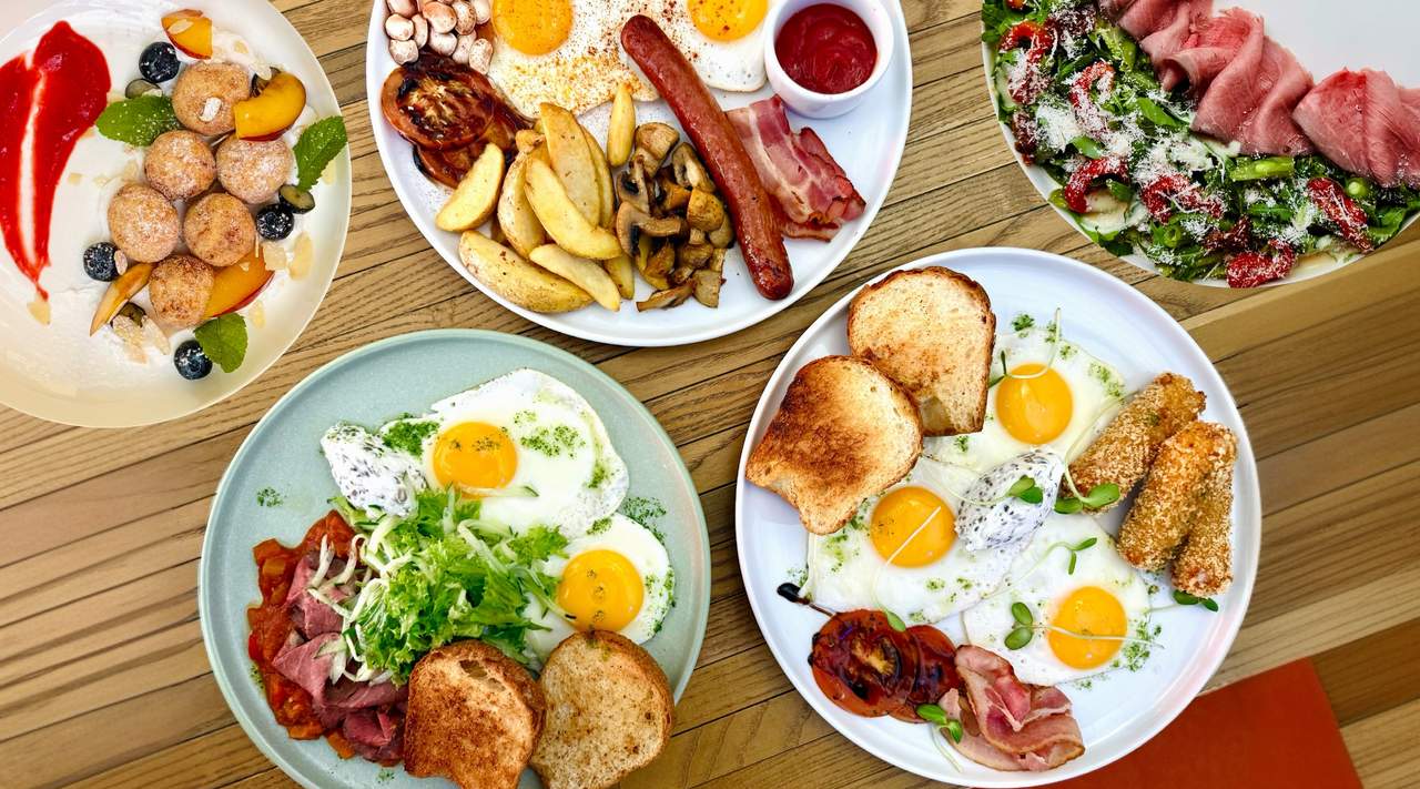ростбіф sous vide, смажені яйця, баклажанове соте, злакова паста, тепла бріош, мікс зелені з огірком, зелене масло