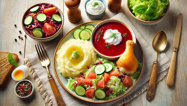 Солянка ( подається зі сметаною ) - 2 порції Картопля по-селянськи - 2 порції СОУС ФІРМОВИЙ «ЧАСНИКОВИЙ» до картоплі - 2 порції Мʼясна страва на вибір - 2 порції Салат з свіжих овочів - 2 порції КОЛА 0.75 - 1 пляшка Хліб - 4шм Одноразові прибори - 2 набори
