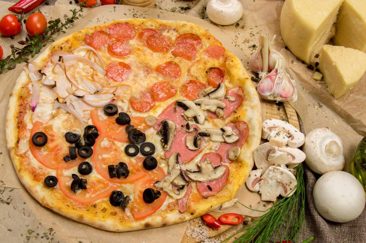 Помідор, шинка, курка, печериці, салямі, оливки, перець болгарський, ковбаски баварські, Моцарела, соус Пармезан, спеції