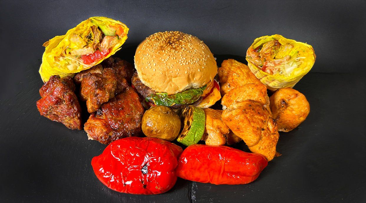 200 грамів шашлику, 100 грамів овочів гриль, 100 грамів картоплі на вибір, 1 соус та лаваш