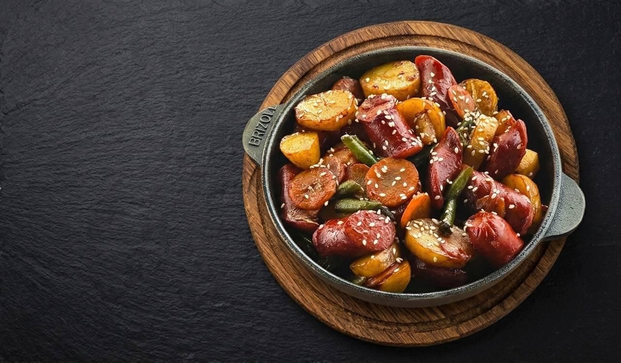 Свинина на гарячій пательні. Соковита свинина, обсмажена з золотистою картоплею, лісовими грибами, морквою та цибулею. Особливого аромату додають часник та свіжа петрушка.