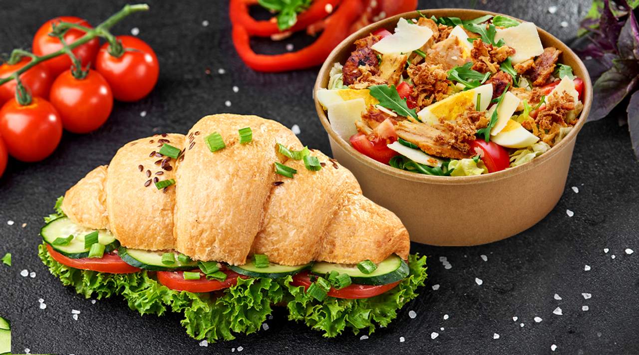 Круасан, помідор, сир Пармезан, курятина, салат Айсберг, соус Цезар