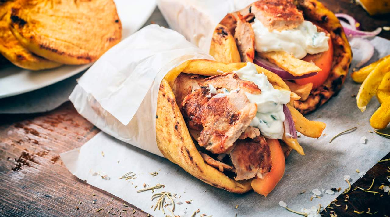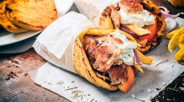 Choose between chicken, beef or pork. Cubed meat skewer, tzatziki, onions, tomatoes, fries wrapped inside a pita