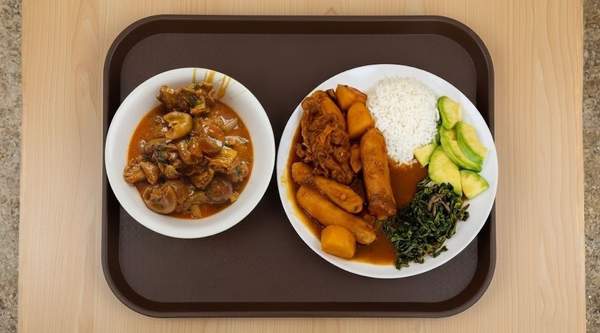 Local staples accompanied by beef cooked in a thick groundnut paste
