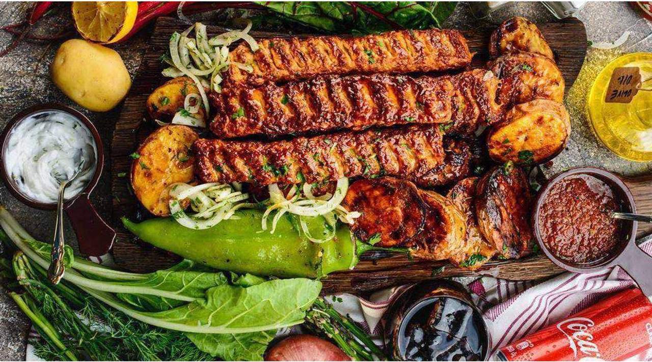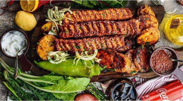 Հավի քաբաբ 5հատ Տավարի քաբաբ 5հատ Պլեճ 4հատ Կծու պղպեղ 1 հատ Սոխ,կանաչի Լավաշ 8հատ
