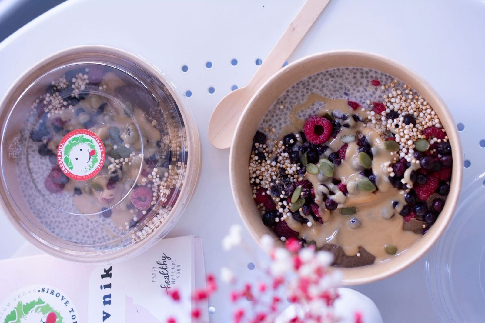 Beluga leće, chia sjemenke, banane, kakao, indijski orah, svježe datule, maslac od lješnjaka, pečeni lješnjak, bademi, šumska borovnica, maline, sjemenke bundeve, ekspandirana quinoa