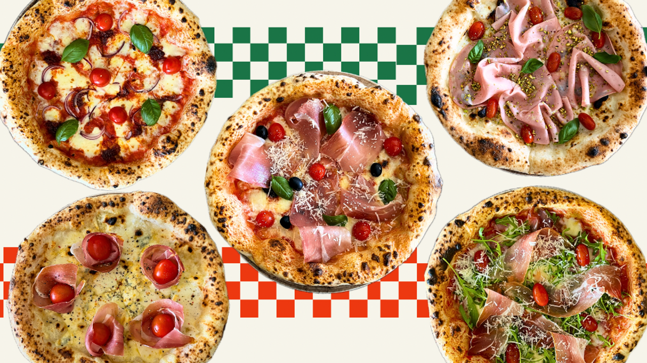San Marzano pelat, 'Nduja, mozzarella (fior di latte), ljubičasti luk, čeri paradajz, svjež bosiljak