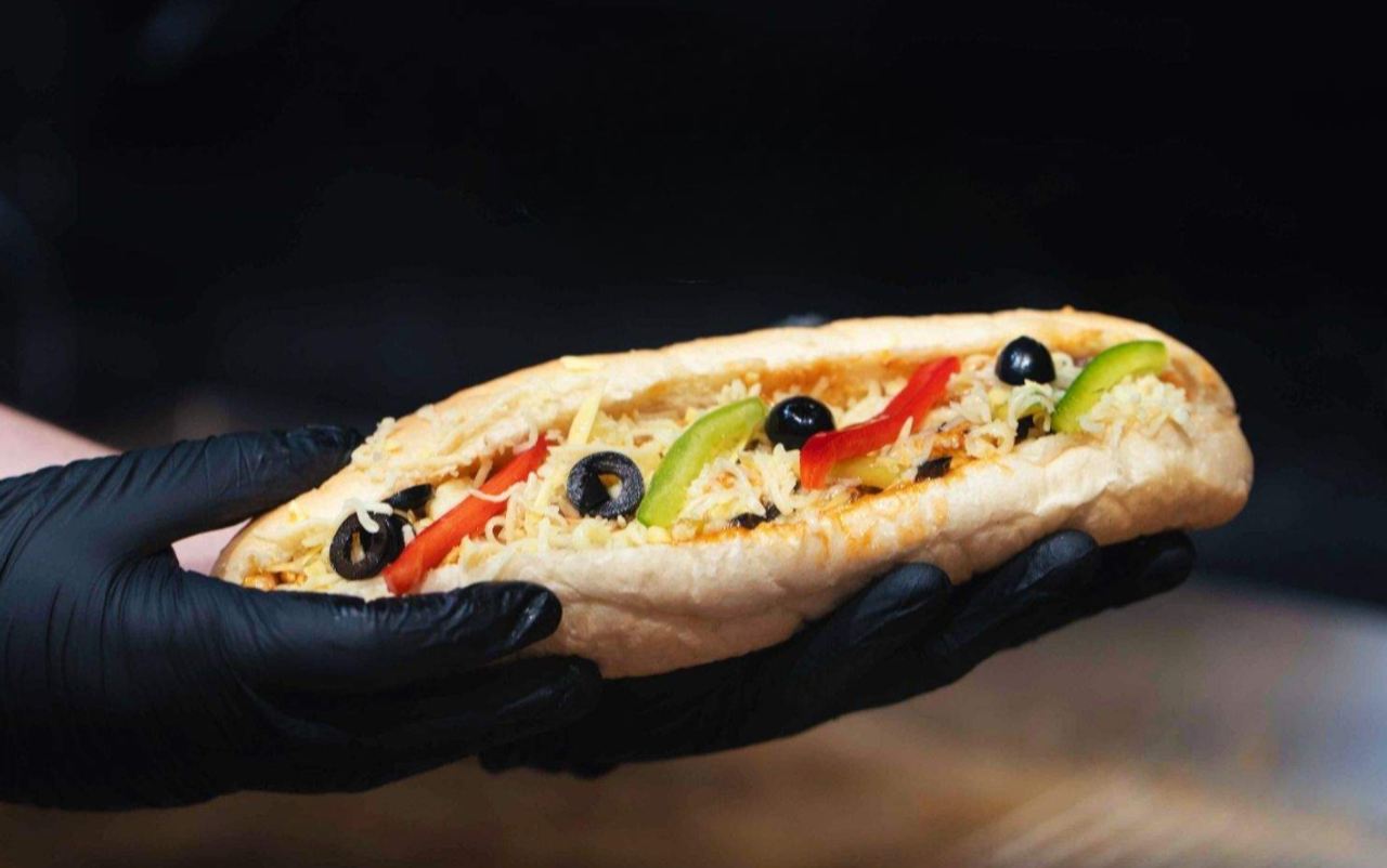 Kifla hljeb, grilana piletina, paprika, crne masline, origano sir, pizza umak