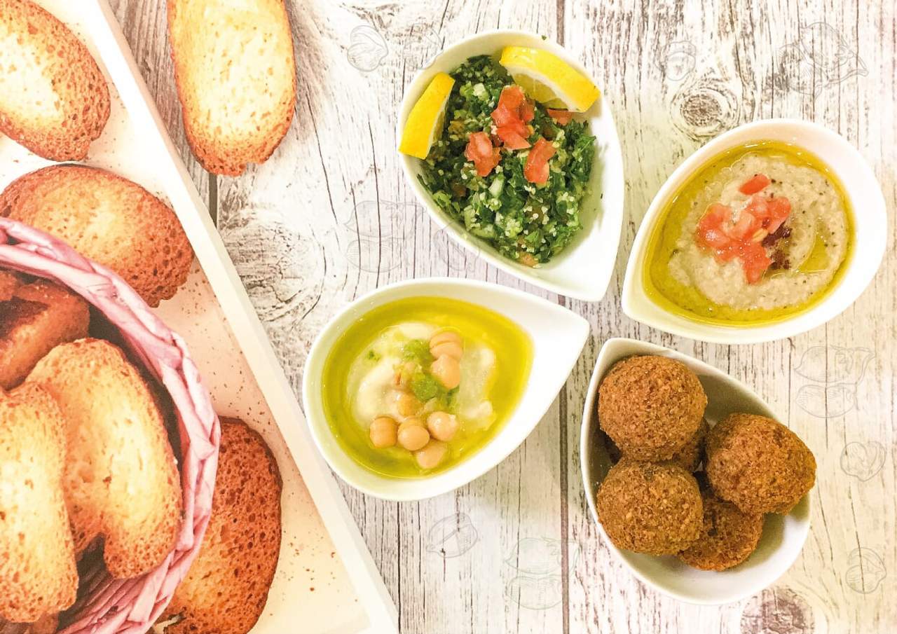Sastavljen od manjih porcija humusa mutabela, tabule salate, 5 komada falafela i mali somun