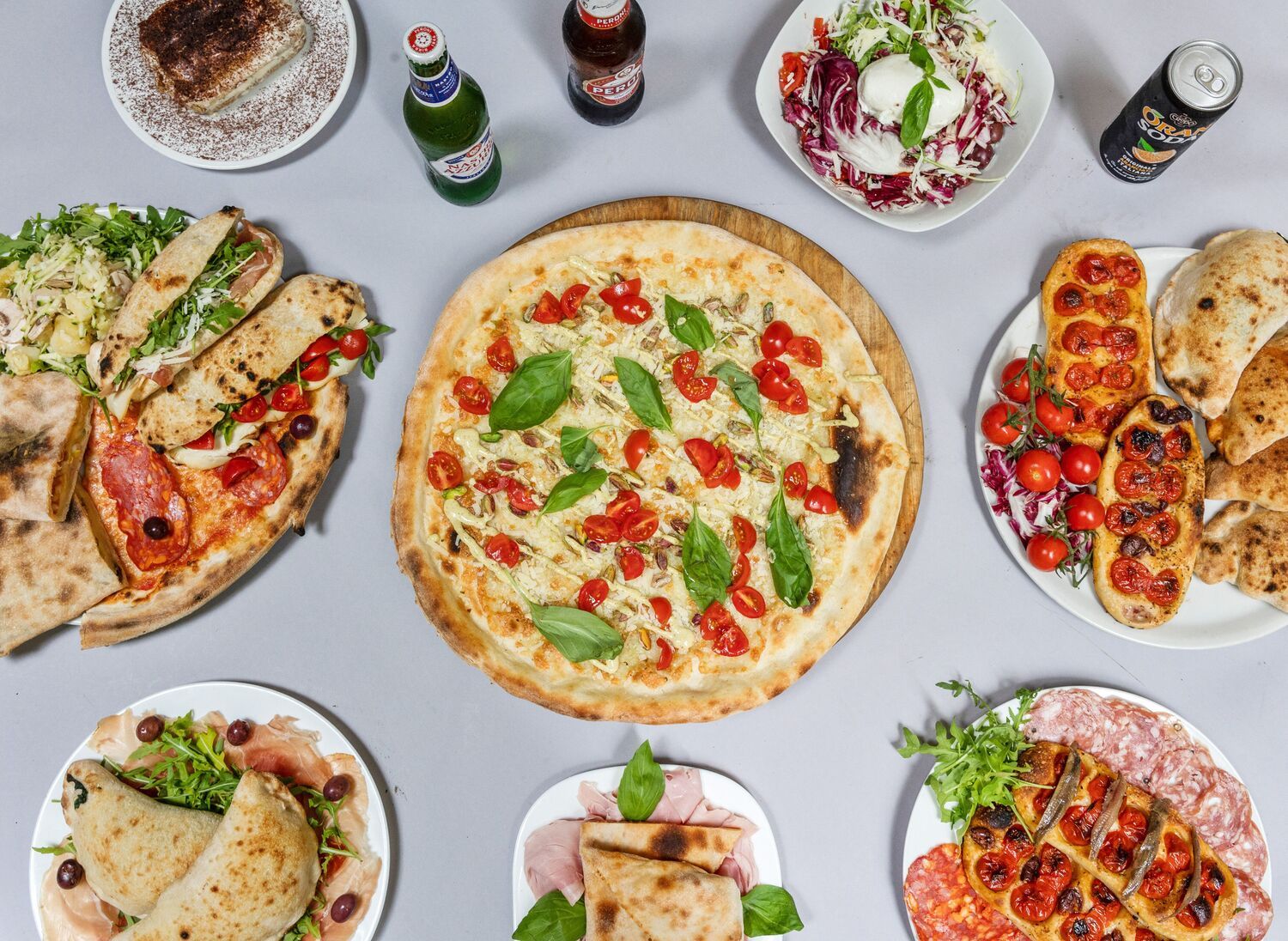 Paradajz sos, sir, mozzarella, cherry paradajz, bosiljak, pesto