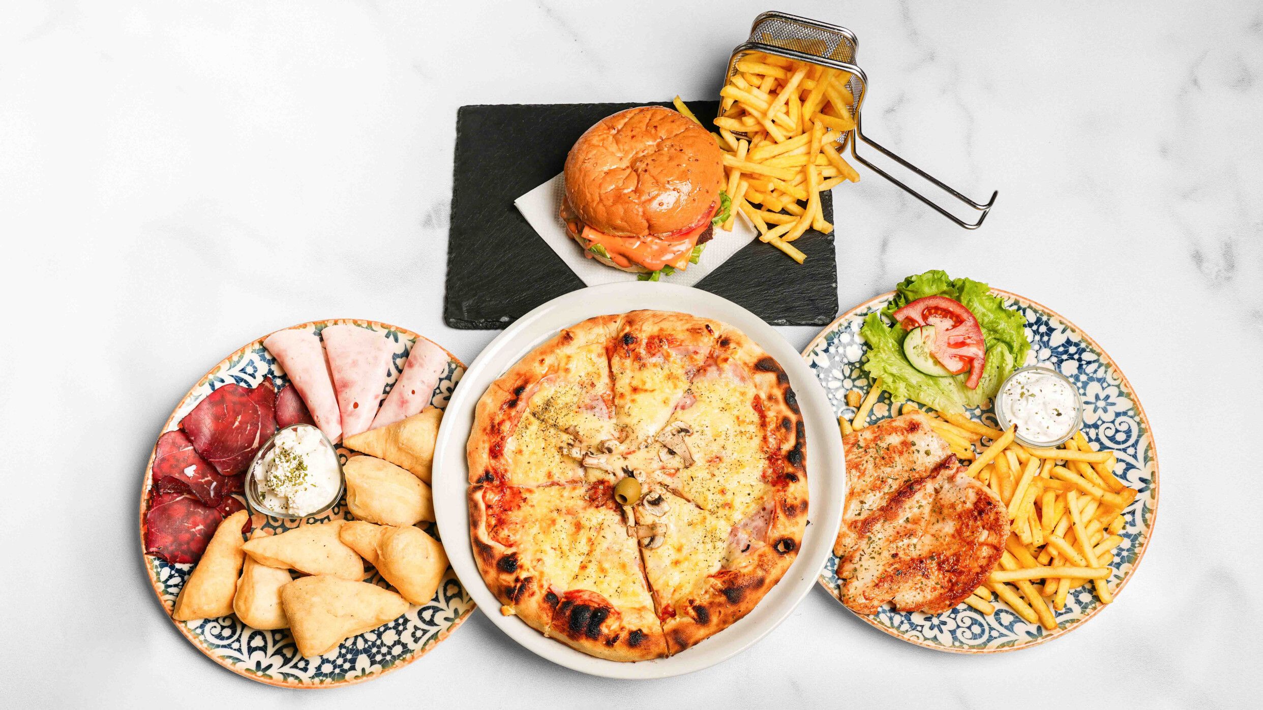 Uštipci, kajmak, svježi sir, pureća šunka, suho meso