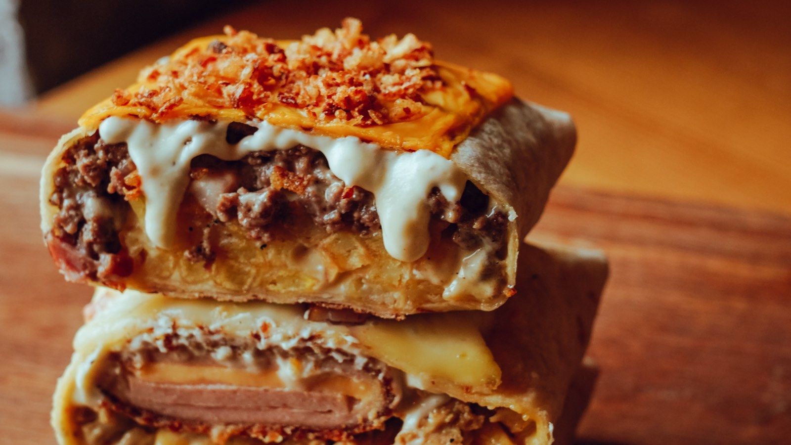 Телешка кайма | бекон | пържени картофки | сос Биджи бъргър | сос Фромажер -.Гратине(запечено върху такосо) Чедър и лучен чипс