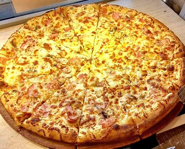 56см. 1.6кг Пицата ще бъде сложена в 3 кутии, всяка с по 4 парчета.