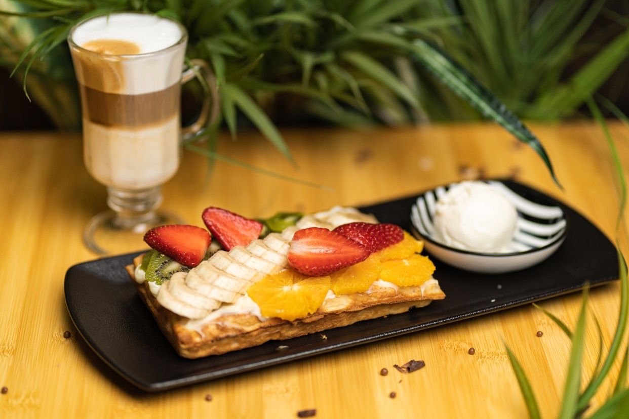 кафе еспресо прясно мляко сос карамел бита сметана крокан