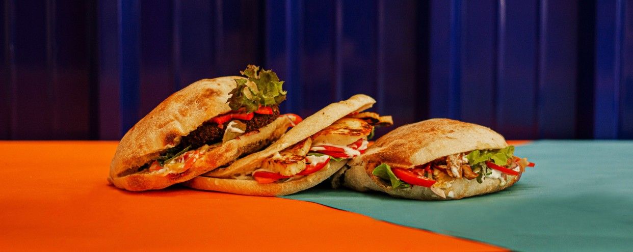 Ръчно приготвен хляб, хтипити, рукола, червен лук със сумак и магданоз, домат, мариновано червено зеле, песто майонеза